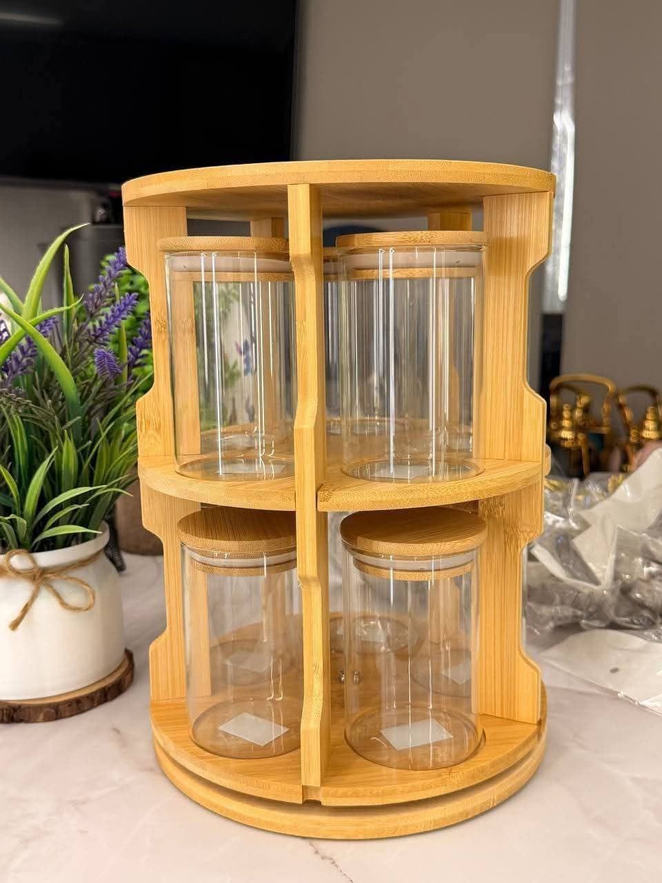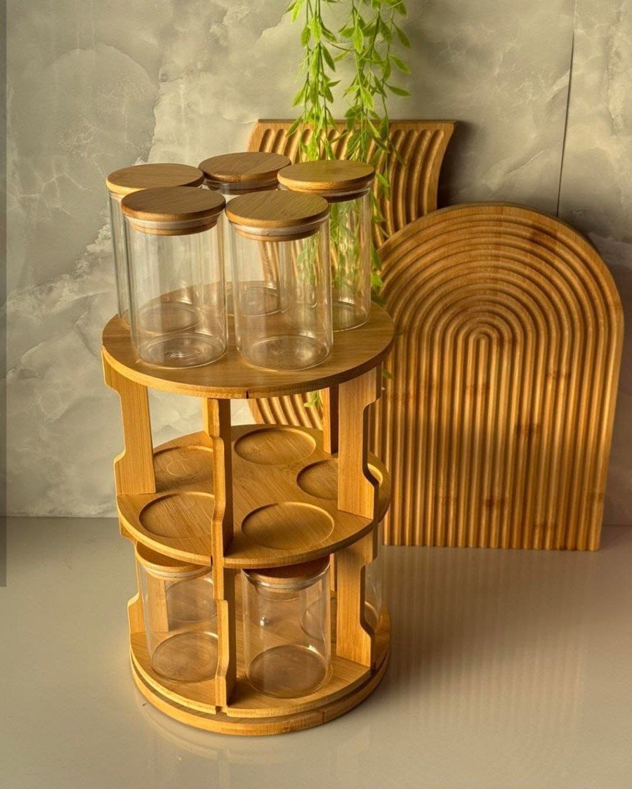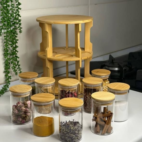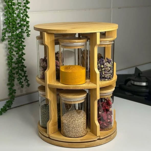 لمسة فخامة وتنظيم مطبخك يستحقها! ✨❤️ جددي مطبخك ووفري مساحتك مع طقم التوابل الخشبي الدوار، القطعة التي تجمع بين الأناقة العصرية والعملية الفائقة. صُمم هذا الطقم خصيصاً ليجعل الوصول لبهاراتك المفضلة أسرع وأسهل بلمسة واحدة.